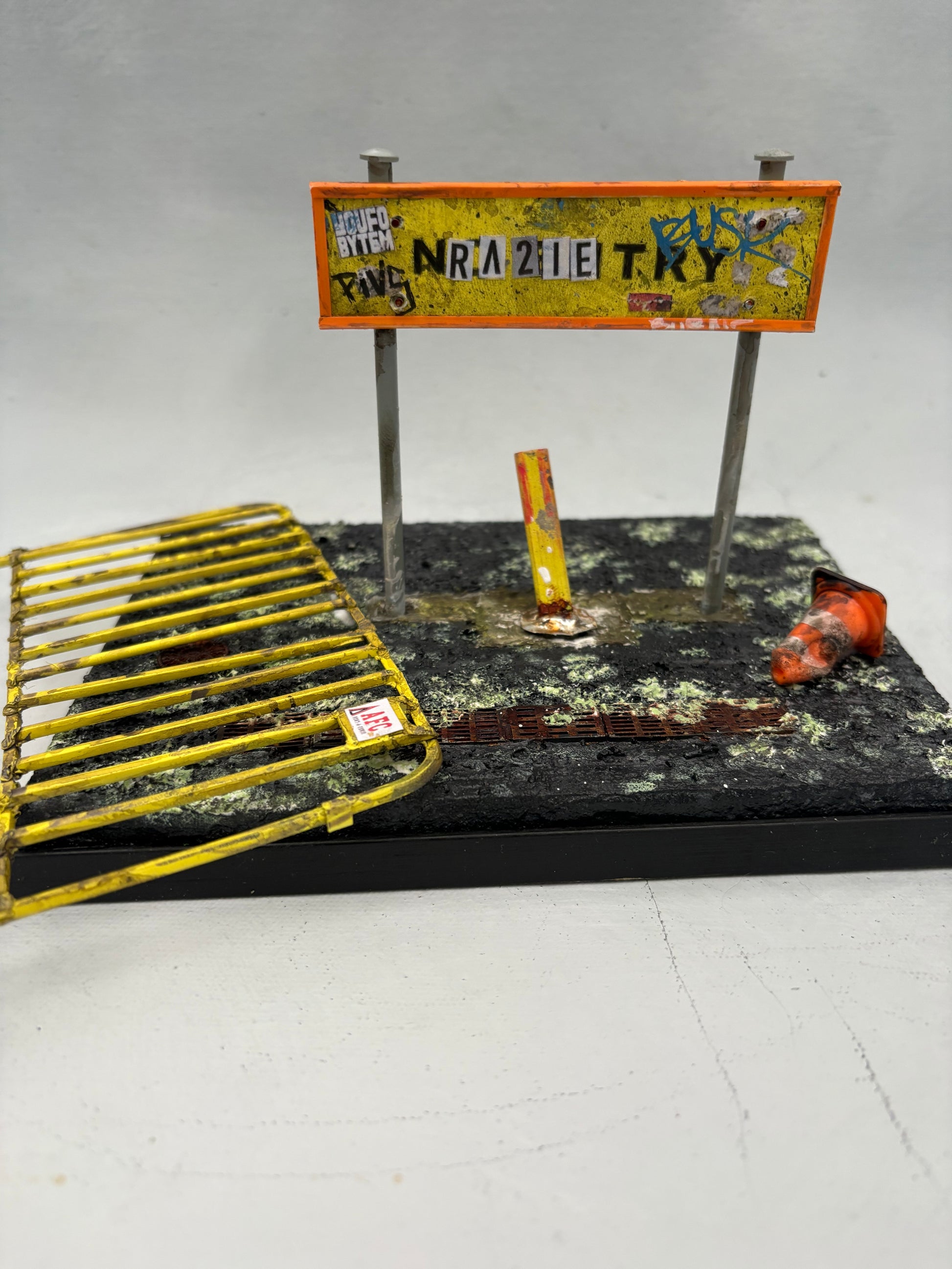 Every detail has been crafted by hand: the scuffed pavement, splattered paint, bent barrier, even the fallen traffic cone. The worn signage mirrors the real graffitied setup on site, creating a perfect little snapshot of the alley’s lived-in charm.